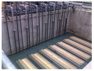 (3)調節池出水用提升泵提升到缺氧池,同時經過曝氣硝化過的污水回流進行反硝化脫氮。出水進入接觸氧化池,通過曝氣進行好氧生化處理同時進行硝化反應。